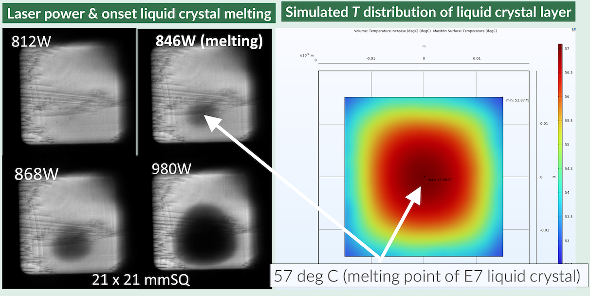 The team found that the molten spot — which occurs due to the phase transformation at 57°C — looks the same in both the COMSOL Multiphysics® simulation and real-world measurement. (The measurement consisted of cross-polarized images where the melting transition also looks like a dark spot, which appears at 57°C with a laser power of 846 Watts.)